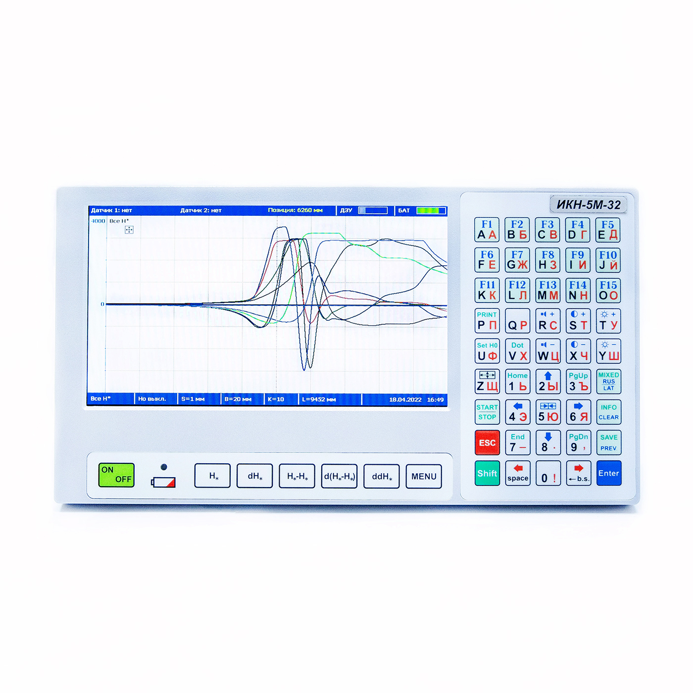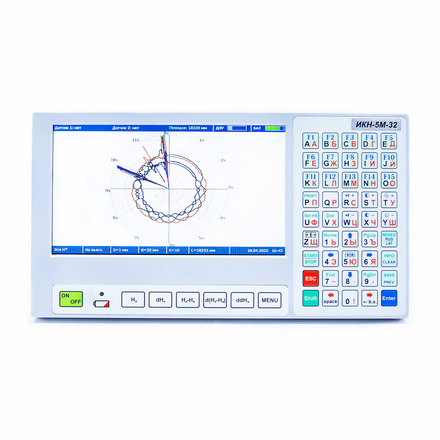 - Basic keyboard (45 keys) with complete set of figures and letters (Russian and English) allowing not only to control the inspection process but also to make the necessary records and comments to the instrument memory and additional keyboard (7 keys) for extended functions of the data processing program on the instrument