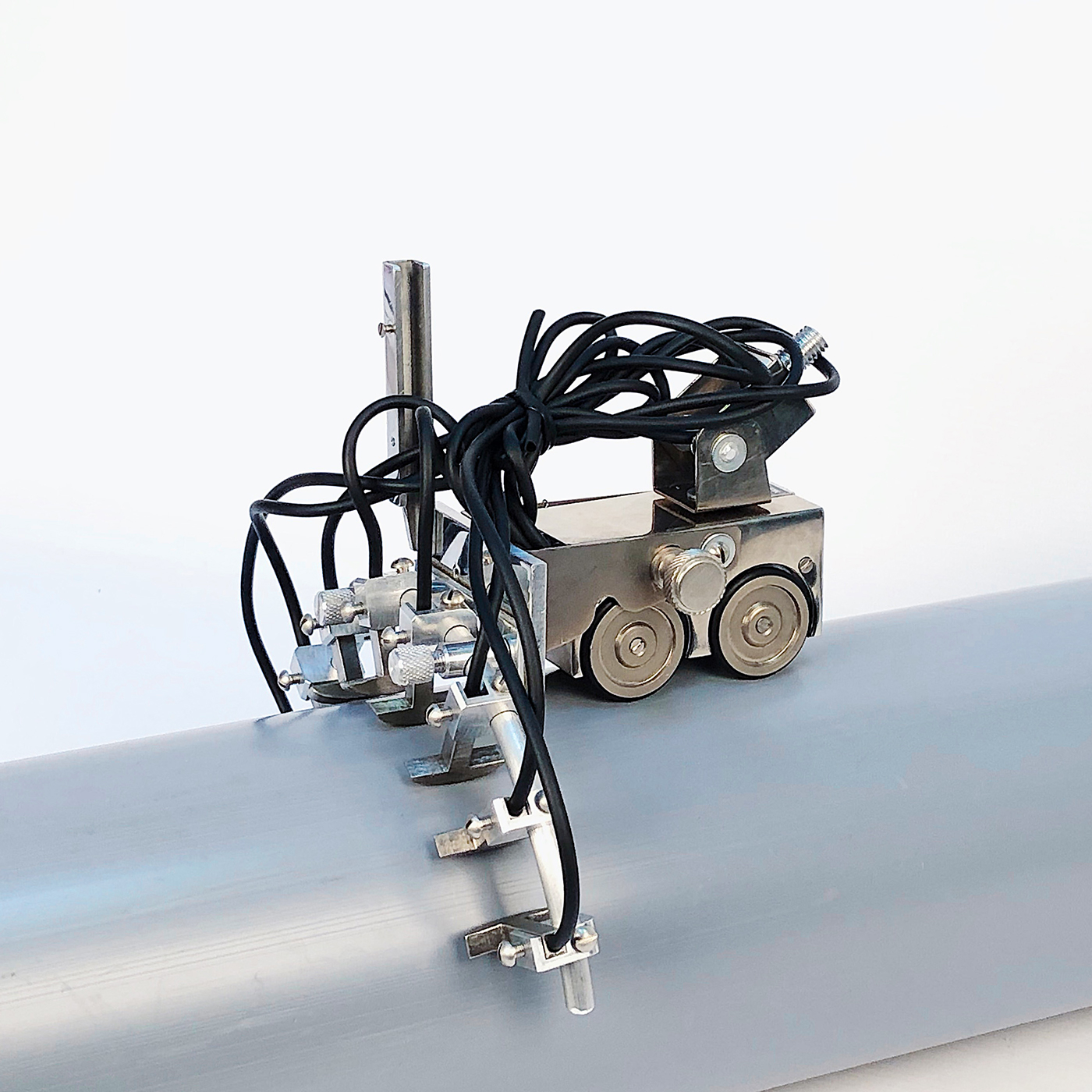 The scanning device with 8 flux-gate transducers for measurement of the normal magnetic field component is designed for large-diameter pipelines, vessels and apparatuses shells inspection. It is manufactured on the basis of the Type 1-8M scanning device. The extended distance between the flux-gate transducers allows increasing the speed of large-diameter pipelines, vessels and apparatuses shells inspection.