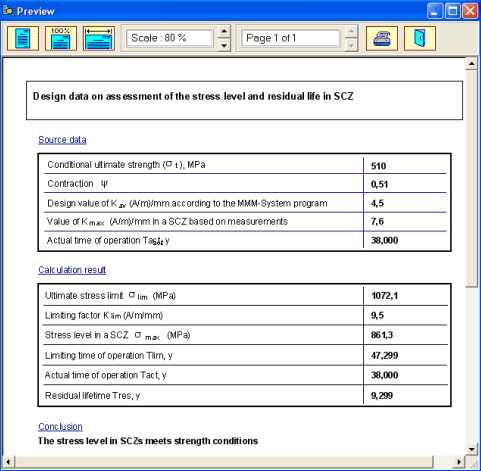 The program uses reference mechanical characteristics of the Inspection Object's metal and energy criteria of the Inspection Object's stress-strain state, obtained during the inspection by the MMM method.