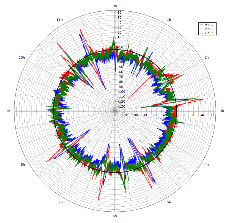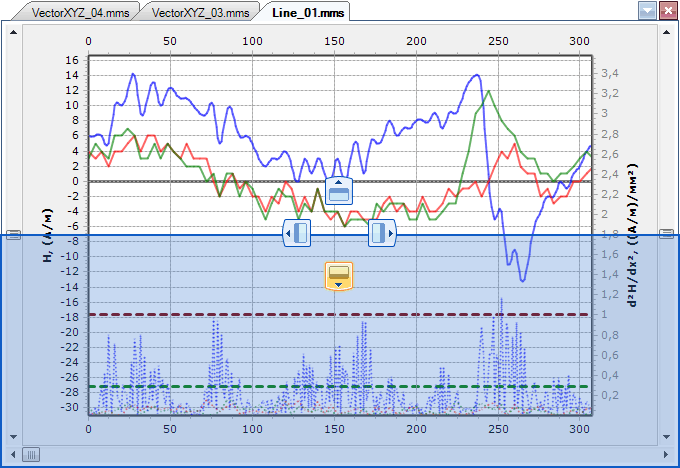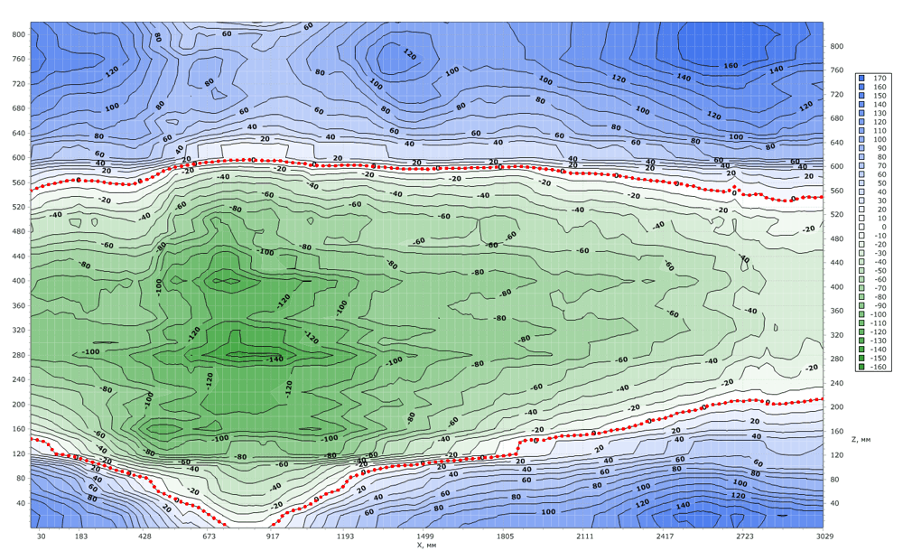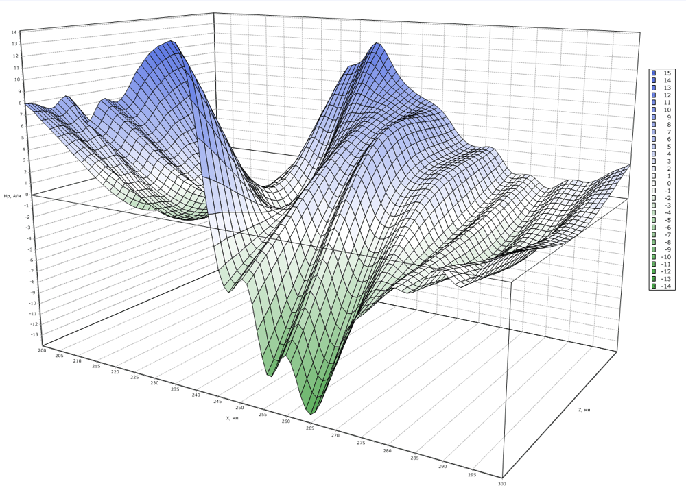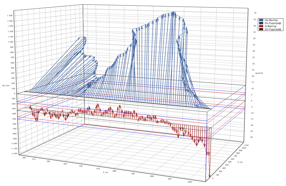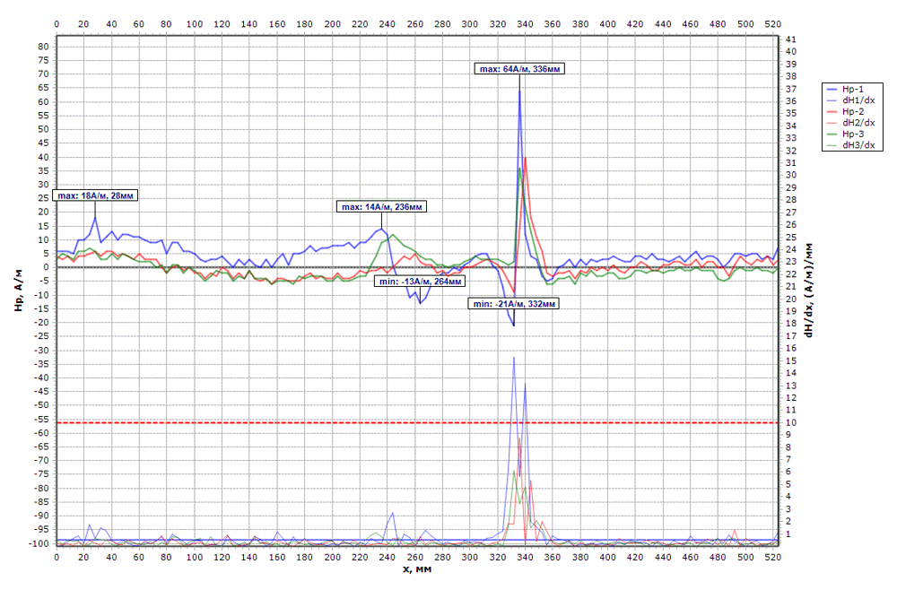 Using the residual magnetization distribution graphs (Нр-graphs) the program can automatically plot the graphs of distribution of differentials, Нр gradient (dH/dx, dH/dz, |grad Hp| - graphs) and other diagnostic parameters, characterizing the level of stress concentration. And using these graphs, in accordance with the inspection technique, it can identify the limiting stress concentration zones (damage development zones).